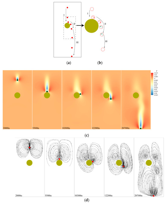 The instantaneous position of a single circular particle’s sedimentation in a cavity containing a single obstacle is shown in Figure 5a, where the entire sedimentation process of the particle is divided into three stages: Stage 1 is the free-fall motion of the particle in Region I under the action of gravity; Stage 2 starts from the time the particle enters Region II and starts to make contact with the obstacle until it completely leaves, during which the particle’s sedimentation trend is slowed down due to the obstruction of the obstacle, and the particle will tumble around the obstacle, resulting in translational motion; and Stage 3 is the free-fall motion of the particle until it sinks to the bottom after entering Region III, and the particle comes to rest. From the local enlargement in Figure 5b, it can be seen that after entering Region II, the particle rotates clockwise around the obstacle, then changes from clockwise to counterclockwise rotation, and after a period of free-fall, its rotation disappears, and it sinks until it reaches the bottom. The velocity in y-direction contour at different times during the particle sedimentation process is shown in Figure 5c, from which it can be seen that the region with the highest downward velocity of the fluid in the cavity is always behind the particle movement. When the particle enters Region II, the downward velocity of the fluid decreases due to the obstruction of the obstacle, and when the particle enters Region III, this velocity gradually increases. Figure 5d shows the streamline distribution near the particle, from which it can be seen that the sedimentation of the particle drives the surrounding fluid to form vortices. When sedimentation occurs in Region I, the vortices are symmetrically distributed on the left and right sides of the particle. As the particle gradually approaches the obstacle, the vortices are squeezed by the obstacle and gradually converge above the particle. After entering Region II, due to the obstruction of the obstacle, the left vortex stays above the obstacle, and the right vortex moves downward with the particle. After the particle enters Region III, a new vortex is generated on its left side, and its size gradually increases as the particle moves away from the obstacle.