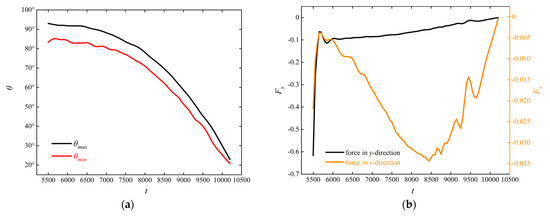 Figure 9. Instantaneous curves in the area of obstacles subjected to particle action: (a) maximum and minimum central angles; (b) forces in y- and x-directions.