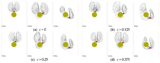 Figure 10. Streamline diagram of particle sedimentation at different ε .