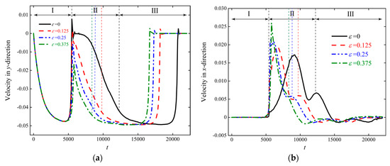 Figure 11. Instantaneous velocity curves of particle sedimentation at different ε : (a) y-direction; (b) x-direction.