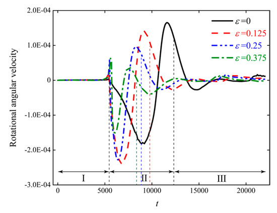 Figure 13. Instantaneous curves of rotational angular velocity for particle sedimentation at different ε .