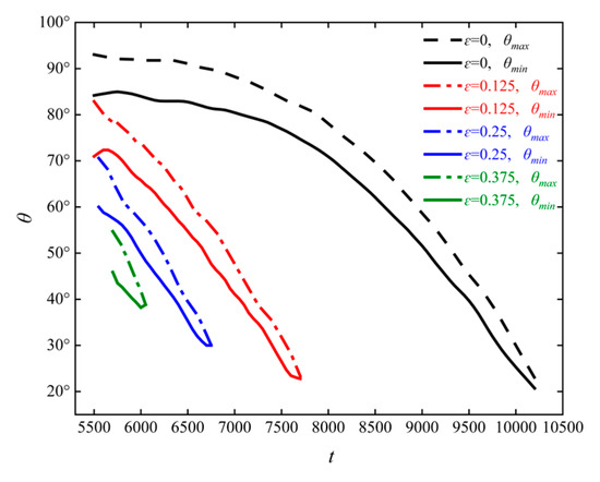 Figure 14. The instantaneous curves of the maximum and minimum central angles corresponding to the area of the obstacle subjected to particle action at different ε .