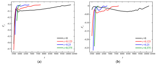 Figure 15. Instantaneous force curves of obstacle subjected to particle action at different ε : (a) y-direction; (b) x-direction.