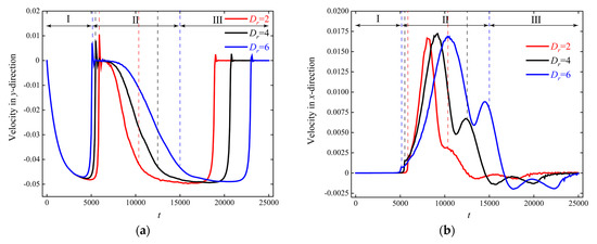 Figure 17. Instantaneous velocity curves of particle sedimentation at different Dr: (a) y-direction; (b) x-direction.
