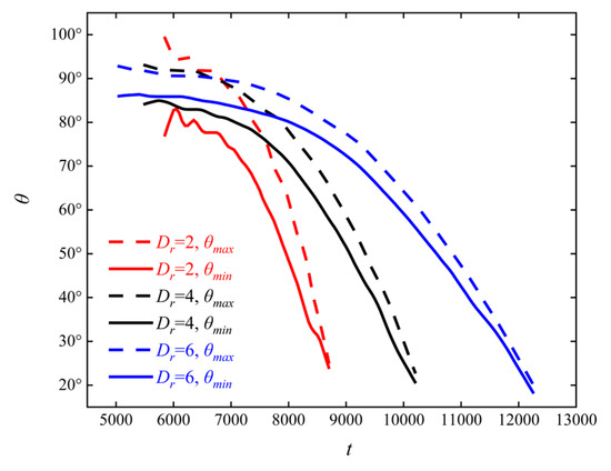 Figure 19. The instantaneous curves of the maximum and minimum central angles corresponding to the area of the obstacle subjected to particle action at different Dr.