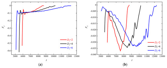 Figure 8. Contours of forces acting on obstacle at different times: (a) y-direction; (b) x-direction.
