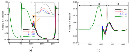 Figure 22. Instantaneous velocity curves of particle sedimentation at different R: (a) y-direction; (b) x-direction.