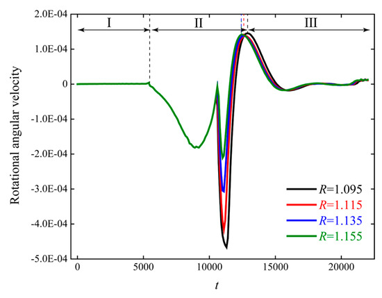 Figure 23. Instantaneous curves of rotational angular velocity for particle sedimentation at different R.