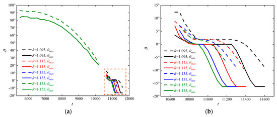 Figure 24. The instantaneous curves of the maximum and minimum central angles corresponding to the area of the obstacle subjected to particle action at different R: (a) full process; (b) second period.