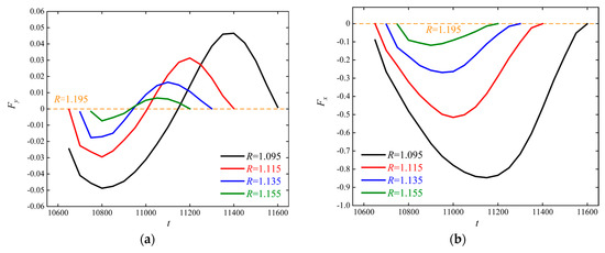 Figure 25. Instantaneous force curves of left obstacle subjected to particle action in second period at different R: (a) y-direction; (b) x-direction.