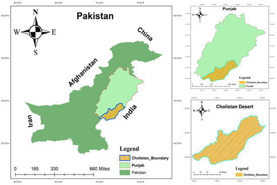 The study focused on the Cholistan Desert Punjab, Pakistan as the designated area of interest, covering an area of approximately 25,900 square kilometers. This desert lies between latitudes 27°42′ to 29°45′ and longitudes 69°52′ to 75°24′ [19]. It supports a population exceeding 0.3 million residents and sustains around 2.0 million livestock. The land in Cholistan is utilized for various purposes, including grasslands, agriculture, built-up areas, and barren terrain. The desert stretches roughly 480 km in length, with a width that varies between 32 and 192 km.