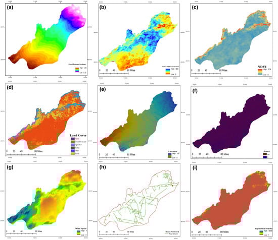 Figure 2. Maps of key conditioning factors for solar PV site suitability (ai).