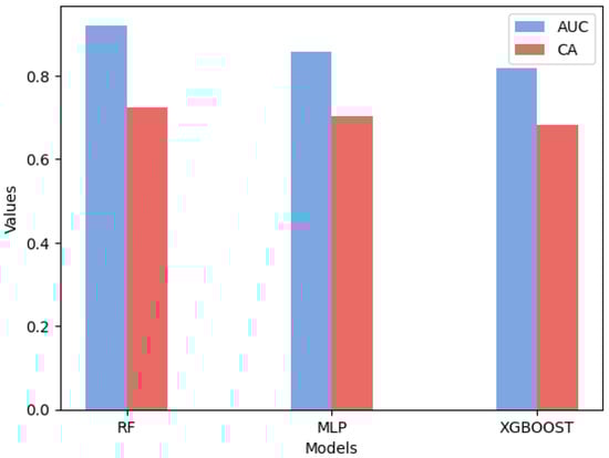 Figure 5. Comparison of RF, XGBoost, and MLP models (AUC and CA) values.