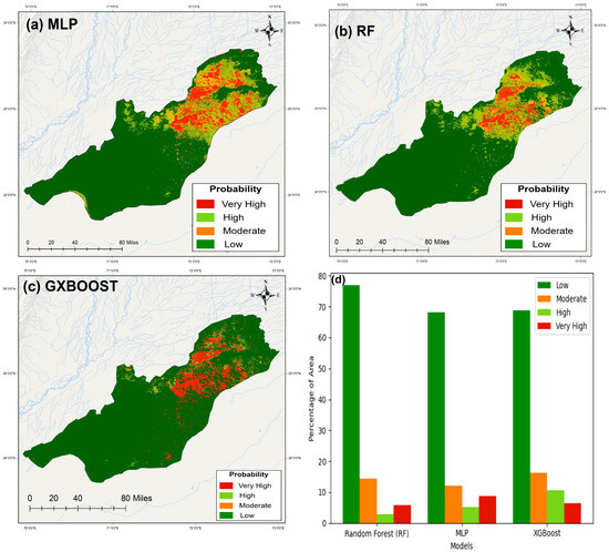 Figure 9. The probability maps for Solar PV installations, generated using the Multilayer Perceptron (MLP) (a), Random Forest (RF) (b), and XGBoost models (c), are presented. The area percentages corresponding to each machine learning model’s output are compared in (d).