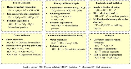 - Feijoo, S.; Yu, X.; Kamali, M.; Appels, L.; Dewil, R. Generation of Oxidative Radicals by Advanced Oxidation Processes (AOPs) in Wastewater Treatment: A Mechanistic, Environmental and Economic Review. Rev. Environ. Sci. Bio/Technol. 2023, 22, 205–248. [Google Scholar] [CrossRef]