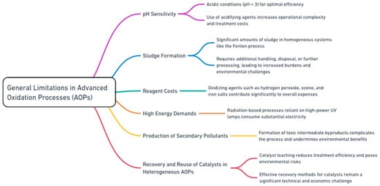 AOPs have gained recognition for their ability to degrade persistent and complex pollutants in wastewater. However, their widespread application is hindered by several inherent challenges. One of the most significant limitations is the pH sensitivity of many AOPs. Processes such as the Fenton and photo-Fenton reactions exhibit optimal efficiency under highly acidic conditions, typically at a pH below 3. This requires the use of acidifying agents, which not only increase operational complexity but also elevate the overall treatment costs [22]. Additionally, sludge formation is a major concern in several AOPs, particularly homogeneous systems like the Fenton process. The substantial amounts of sludge generated during these treatments require additional handling, disposal, or further processing, leading to increased operational burdens and environmental challenges [23]. Reagent costs also represent a critical limitation for many AOPs. Oxidizing agents such as hydrogen peroxide, ozone, and iron salts are essential for driving these processes, yet their recurring consumption contributes significantly to the overall expenses [24]. The high energy demands of certain AOPs further compound this issue. Radiation-based processes such as UV/H2O2 and UV/O3 rely on high-power UV lamps, consuming substantial amounts of electricity, which limits their economic feasibility for large-scale applications [25]. Furthermore, some AOPs inadvertently produce secondary pollutants, including toxic intermediate byproducts, during the degradation of complex organic compounds. The formation of such byproducts necessitates additional treatment steps, complicating the process and undermining its environmental benefits [26]. Another major bottleneck lies in the recovery and reuse of catalysts in heterogeneous AOPs. Catalysts such as TiO2 and Fe3O4 often leach into treated water, reducing the overall treatment efficiency and posing environmental risks. Effective recovery methods for these catalysts remain a significant technical and economic challenge, further limiting the widespread adoption of AOPs [27]. Figure 3 highlights the general limitations associated with conventional AOPs.
