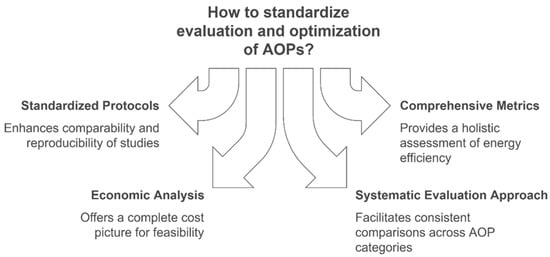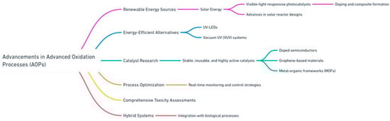 Efforts to address the energy demands of radiation-based AOPs have led to the development of energy-efficient alternatives, such as UV-LEDs and vacuum UV (VUV) systems. These technologies provide higher photon energy while reducing power consumption, offering a more sustainable solution for processes like UV/H2O2 and UV/O3 [38]. Catalyst research has also made significant strides. The development of stable, reusable, and highly active catalysts, including doped semiconductors, graphene-based materials, and metal–organic frameworks (MOFs), has addressed issues of leaching and reduced activity, particularly in heterogeneous systems [8]. Process optimization has emerged as another critical area of innovation. Advances in real-time monitoring and control strategies have enabled the refinement of operational parameters, reducing both energy and reagent consumption while enhancing degradation efficiencies. Furthermore, comprehensive toxicity assessments are increasingly being incorporated into AOP development to ensure the environmental safety of treated water and mitigate the risks associated with secondary pollutants [39]. Hybrid systems have also shown great promise in addressing the limitations of standalone AOPs. By integrating AOPs with biological processes, researchers have demonstrated significant improvements in the treatment of industrial effluents, such as textile wastewater and pulp and paper mill effluents. These integrated systems leverage AOPs as a pretreatment step to break down recalcitrant compounds, enhancing the biodegradability of wastewater for subsequent biological treatment. This approach has proven to be both cost-effective and environmentally sustainable, providing a pathway for large-scale application [40]. Advancements in catalyst innovation, reactor optimization, process integration, and energy efficiency have significantly enhanced the effectiveness and sustainability of advanced oxidation processes. These developments have the potential to address longstanding challenges, paving the way for wastewater treatment technologies that are both practical and environmentally responsible. Figure 4 highlights the key advancements in AOP technologies addressing current limitations.