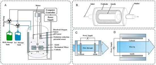 Configuration of (A) plate-frame, (B) tubular plug-flow, (C) flow-through, (D) flow-by EO reactors.