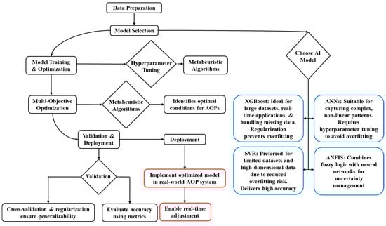 The selection of AI/ML methods for optimizing AOPs depends on specific operational and data-driven requirements, such as the scale and quality of datasets, the complexity of relationships between variables (e.g., non-linear or high-dimensional interactions), and the need to mitigate overfitting risks in limited data scenarios. Additionally, the ability to balance multi-objective trade-offs, such as maximizing pollutant removal efficiency while minimizing energy consumption, influences the choice of models, with metaheuristic algorithms often complementing AI techniques to address these challenges. Figure 7 illustrates the integrated AI-driven AOP optimization workflow, aligning methodological choices with practical implementation stages for enhanced treatment efficacy.