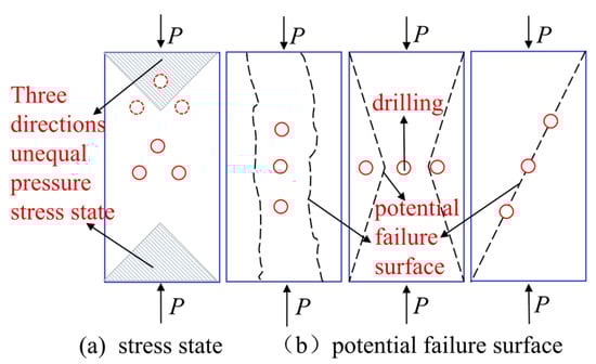 Different drilling layouts will form different weak-strength surfaces in the specimen, which will guide the crack propagation and lead to different failure modes of the specimen. The vertical-layout drilling specimen (Figure 8b) formed a weak-strength surface on the central axis of the specimen, has a strong tensile stress zone along the axial direction, and the cracks are mainly tensile cracks. The tensile crack penetrated through the vertical drilling to form a vertical pressure relief zone, resulting in the macroscopic failure mode of the specimen being tensile failure. There was strong compression interaction between the holes of the specimen with horizontal-layout drilling (Figure 8c), and basically no cracks occurred on the left and right sides of the drilling, but only on the upper and lower ends of the drilling. Although the horizontal-layout drilling formed a horizontal weak-strength surface in the middle of the specimen, the linkage failure could not be formed between the drillings. The cracks at the upper and lower ends continued to develop and form macroscopic cracks, resulting in the macroscopic failure mode of the specimen being an X-conjugated inclined-plane shear failure. Diagonal-layout drilling specimens (Figure 8d) artificially form a weak-strength surface in the diagonal direction of the specimen, resulting in strong tensile interaction along the diagonal direction. The shear stress is the largest in the diagonal direction of the drillings, so the cracks eventually penetrate along the diagonal direction of the drillings, forming a diagonal pressure relief zone, and the final failure mode of the specimen is single-inclined-plane shear failure. The drilling pressure relief zones of the triangular-layout drilling specimen (Figure 8e) overlap each other, thus forming a weak-strength area in the middle of the specimen. With the further increase in axial stress, tensile cracks and shear cracks are fully developed in this area, and the drillings are connected with each other. In the middle of the specimen, a large range of drilling pressure relief zone is formed, resulting in the final failure mode of the specimen being tensile shear mixed failure.