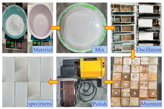 The internal joints and cracks of raw coal specimens are significantly developed, and their mechanical properties are unstable. In order to reduce the influence of the defects of the specimens themselves on the experimental results, many researchers choose to use physically similar materials to cast specimens for experimental research. They chose α-type high-strength anhydrous gypsum: water = 1:0.4 as the material to pour the cuboid specimen with side lengths of 100 mm × 100 mm × 200 mm [25]. The specimen preparation process is shown in Figure 2.