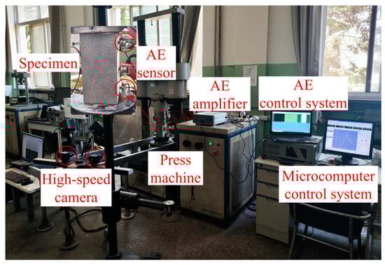 As shown in Figure 3, the test system consists of a microcomputer-controlled electro-hydraulic servo pressure test system, two high-speed cameras, and an acoustic emission acquisition and analysis system. The maximum static load that can be applied by this test system is 1000 kN. Two high-speed cameras were used to record the surface crack evolution process and fracture characteristics of the specimen. The camera resolution is 2448 × 2048 pixels, and the frame rate is up to 70 fps.
