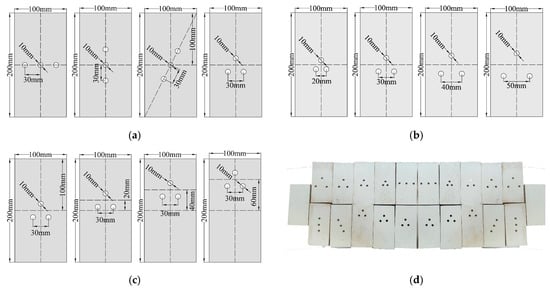According to the index of the drilling diameter-to-specimen width ratio (D/W) [33], the drilling diameter was determined to be 10 mm. The drilling parameters studied in this experiment include drilling layout, drilling spacing and drilling position.