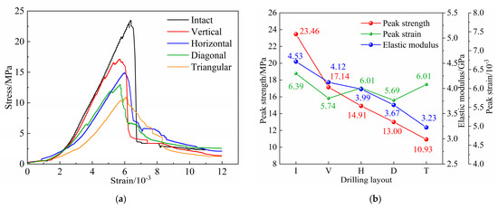 Stress–strain curves (a) and mechanical parameters (b) of specimens with different drilling layouts.