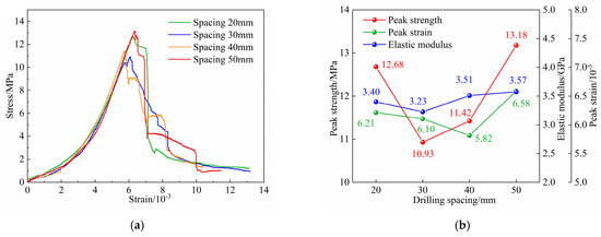 As shown in Figure 6a, the stress–strain curves of specimens with different drilling spacings were composed of four stages: the fracture compaction stage, the elastic deformation stage, the plastic deformation stage and the post-peak failure stage. It can be seen that the curve coincidence degree of specimens with different drilling spacings is higher in the crack compression stage and the elastic deformation stage, but the curve difference between the plastic deformation stage and the post-peak failure stage is large. With the increase in drilling spacing, the curve of the post-peak failure stage first becomes gentle and then steep, indicating that the post-peak energy release rate of the specimen also decreases first and then increases. The residual strength of the specimens is roughly the same.