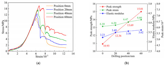 As shown in Figure 7b, there is a certain correlation between peak strength and drilling location. With the upward movement of the drilling position, the peak strength gradually increased to 10.93 MPa, 12.36 MPa, 13.69 MPa and 15.01 MPa, in that order. The peak strength is minimum when the drilling position is in the middle of the specimen, which may be caused by the maximum damage to the specimen by drilling in the middle position. The peak strain and elastic modulus are basically unchanged as the drilling position moves upward.