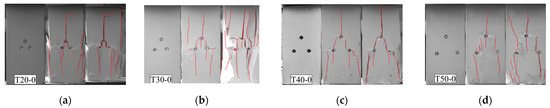 Surface failure diagrams of specimens with different drilling spacing: (a) T20-0; (b) T30-0; (c) T40-0; (d) T50-0.