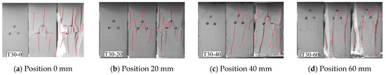 Surface failure diagrams of specimens at different drilling positions: (a) T30-0; (b) T30-20; (c) T30-40; (d) T30-60.