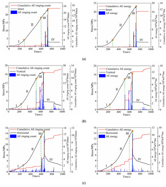 Stable stage (I): fracture pressure tight stage. The specimens were subjected to static load compaction, and the microcracks gradually closed. Due to the closure of natural defects, no significant AE activities were generated, and only a small amount of acoustic emission signals were recorded. The cumulative AE ringing count grows at a faster rate than the cumulative AE energy.