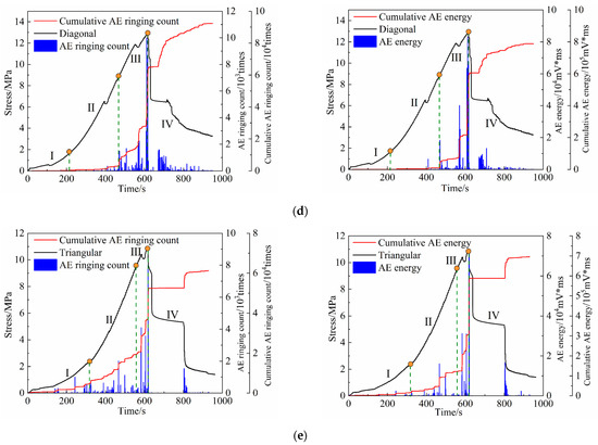 According to Figure 11, the AE activities of specimens with different drilling layouts during uniaxial loading were studied. The AE characteristic parameters of the specimens with different drilling layouts have a strong correlation with the time–stress curve, and the peak value of the AE ringing count, AE energy and stress basically coincide. According to the characteristics of the stress–time curve, cumulative AE ringing count and cumulative AE energy distribution, acoustic emission activity can be divided into four stages: stable stage, rising stage, active stage and vanishing stage.