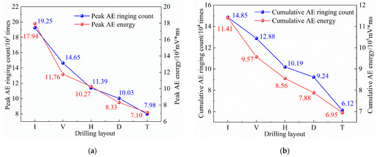 The variation law of characteristic values of AE parameters under different drilling layouts: (a) Peak ringing count and peak energy of AE; (b) Cumulative ringing count and cumulative energy of AE.