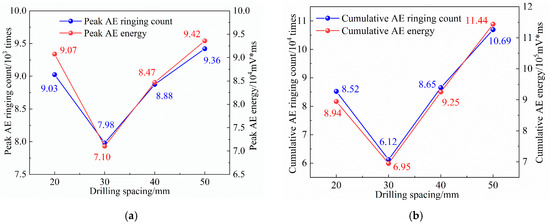 The variation law of characteristic values of AE parameters under different drilling spacings: (a) Peak ringing count and peak energy of AE; (b) Cumulative ringing count and cumulative energy of AE.
