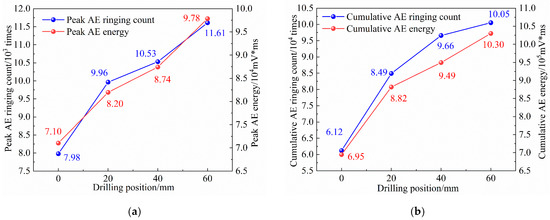 The variation laws of characteristic values of AE parameters under different drilling positions: (a) Peak ringing count and peak energy of AE; (b) Cumulative ringing count and cumulative energy of AE.