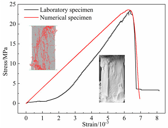 Stress–strain curves of laboratory specimen and numerical simulation model.