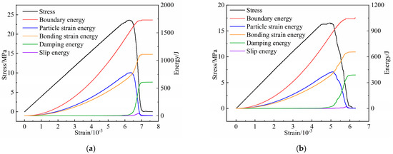 In the process of rock deformation and failure, energy is continuously exchanged with the external environment. Assuming negligible heat exchange between the testing system and the surroundings, the total energy input into the system during rock failure is represented by boundary energy. During loading, this boundary energy is distributed among particle strain energy, cementation strain energy and dissipated energy (including slip energy and damping energy). The Fish language in PFC software is employed to monitor the various energy data during uniaxial compression [35], providing an accurate reflection of the energy evolution process in loading. Figure 18 illustrates the energy evolution curves for both the intact specimen and the T30-0 specimen.