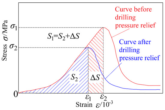 where σ1 is the peak strength before pressure relief; σ2 is the peak strength after pressure relief; ε1 is the peak strain before pressure relief; ε2 is the peak strain after pressure relief; and ΔS is the dissipated strain energy. S1 is the accumulated strain energy before the peak value of pressure relief, and S2 is the residual strain energy before the peak after pressure relief.