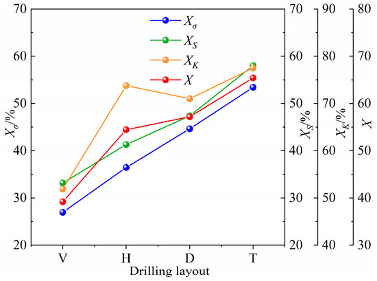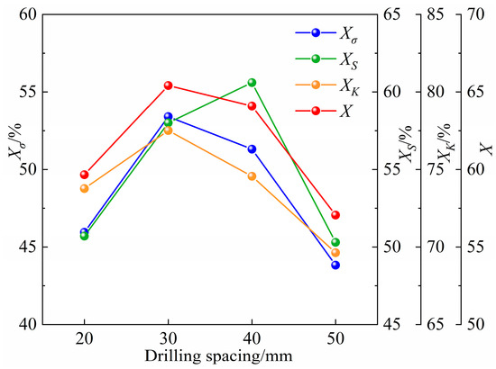 When the drilling layout is determined, the different drilling spacings will affect the stress interaction and the crack propagation process between the drillings, thus affecting the final pressure relief effect. The calculation results of the pressure relief effect indexes of specimens with different spacing modes are shown in Table 6. As shown in Figure 21, compared with the intact specimen, with the increase in drilling spacing, the pressure relief effect evaluation index (X) was first increased and then decreased, and was 59.66, 65.41, 64.09 and 57.06, in sequence. This indicates that the pressure relief effect is best when the drilling spacing is three times the diameter.