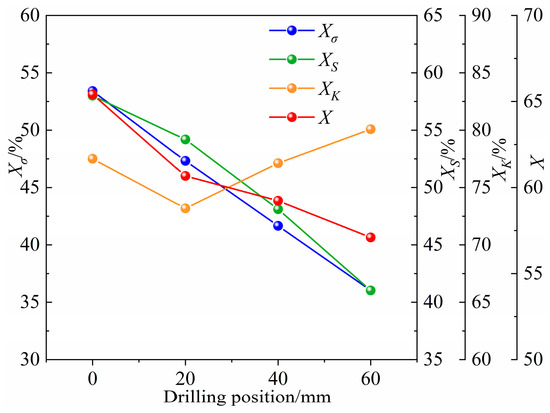 During the determination of drilling layout and spacing, because of the different stress states of specimens during uniaxial compression, the change in drilling position will also affect the pressure relief effect. The calculation results of the pressure relief effect indexes of specimens with different position modes are shown in Table 7. As shown in Figure 22, the strength reduction index and energy dissipation index decreased with the upward movement of the drilling position. The residual strength increases with the upward movement of the drilling position, and the post-peak strain energy is also increased, resulting in the impact energy index gradually decreasing with the upward movement of the drilling position. Compared with the intact specimen, the pressure relief effect evaluation index (X) decreased with the upward movement of the drilling position, and was 65.41, 60.67, 59.23 and 57.10, in sequence. It can be concluded that drilling in the middle of the specimen has the best pressure relief effect.
