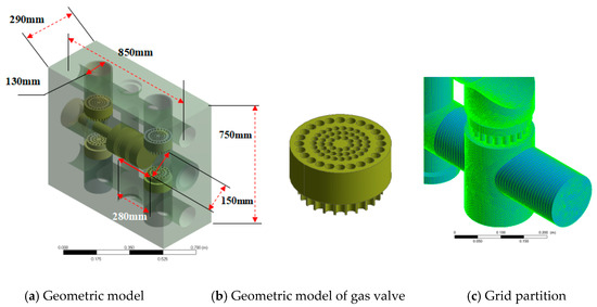 The contact conditions and constraint conditions of motion are as follows: The geometric parameters of the compression cylinder and piston are presented in Figure 3a. Inside the compression cylinder, four air valves are vertically arranged. These valves have small holes and built-in diaphragms. The diaphragms open and close periodically to realize alternating suction and exhaust processes, as depicted in Figure 3b. The entire fluid domain is divided into mixed grids. Specifically, the inlet and outlet valves are divided into unstructured grids, while the cylinder body, connecting rod, piston, etc., are divided into highly structured grids, as shown in Figure 3c.