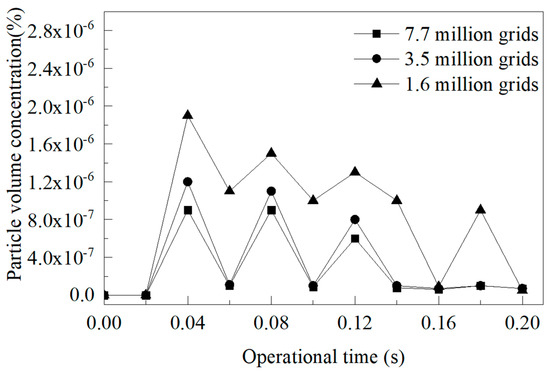 Figure 4 shows the volume fraction of the particle phase at the outlet of the compression cylinder under 1.6 million, 3.5 million, and 7.7 million grids when the operation time is 0.2 s. It can be observed that, firstly, the convergence trend of the model is the same under different grid sizes. Secondly, only when the number of grids exceeds 1.6 million does the volume concentration of particles at the outlet tend to stabilize. Thirdly, when the number of grids increases from 3.5 million to 7.7 million, the volume fraction of the particle phase remains basically unchanged. Therefore, it can be determined that a grid size of 3.5 million can achieve computational stability, while the grid size is relatively small. Therefore, 3.5 million grids were used for the multiphase flow calculation.