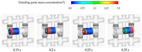 The area of the “grinding paste” attached to the piston is distributed as illustrated in Figure 7 when the dust mass concentration reaches 3.0%, according to the numerical simulation. It is evident that throughout the piston stroke, at both endpoints, the piston is no longer in contact with the cylinder wall. However, the concentration of the “grinding paste” adhering to the piston remains significantly high. This can be ascribed to the adhesive properties of “grinding paste”, which has high viscosity and density. Positioning the piston near the stroke’s midpoint lowers the concentration of “grinding paste” for two reasons. First of all, the piston ring inhibits the transfer of the “grinding paste” to the opposite side. Second, the minimal gap between the piston and the cylinder results in a low mass concentration of the “grinding paste” that can be retained. At dust mass concentrations of 0.5%, 1.0%, 1.5%, 2.0%, or 2.5%, the distribution of the “grinding paste” follows the similar pattern depicted in Figure 6.