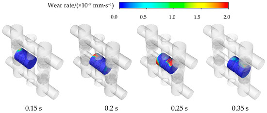 The CFD numerical simulations described in Section 3 demonstrate that the shear stress within the compression cylinder varies when the mass concentration of dust in the “grinding paste” is 3.0%. Specifically, the cylinder wall experiences a minimal shear stress of 0.0001 MPa at both the left and right endpoints of the stroke, since the piston does not come into contact with it during the reciprocating cycle of the intake and exhaust process. As shown in Figure 6, the piston experiences a peak shear stress of up to 0.2 MPa while maintaining contact with the cylinder wall during its full stroke at the midpoint. It was found by Cho et al. [8] that near the end of a piston operating cycle (approximately 0.2 s), both the axial and radial forces reach their peak, causing the maximum shear force. Nevertheless, the acceleration (also called shear stress) is directed oppositely during a cycle. Figure 5 depicts the force magnitudes, indicating that the shear stress direction opposes the piston motion.