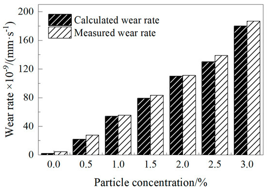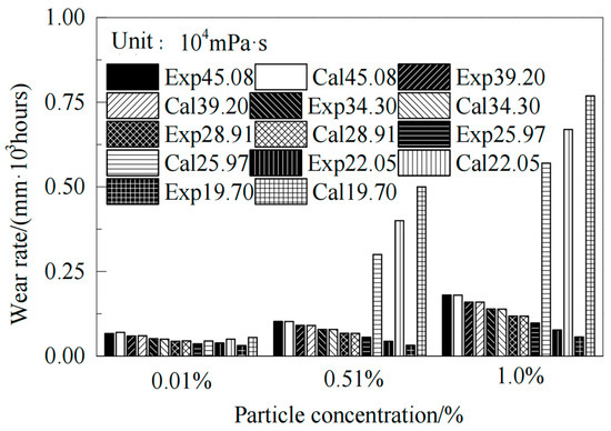 However, when experiments were conducted to examine the effects of these seven lubricants after 1000 h of operation (experiments No. 1, No. 2, No. 3, and No. 7~No. 14), it was found that the wear rate gradually decreased with increasing lubricant viscosity when the dust mass concentration was 0.01%. The experimental results align with the calculated results. When the dust mass concentration is 0.51% and 1.0%, the wear rate increases steeply at lubricant viscosities of 259,700 mPa·s, 220,500 mPa·s, and 196,980 mPa·s (No. 8.5–No. 8.7, No. 9.5–No. 9.7, No. 10.5–No. 10.7), which is more different from the calculated results of Equation (6), as shown in Figure 13.
