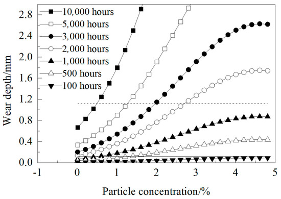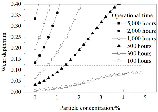 Equation (6) was used to calculate the wear rate per 1000 h of operation with a gradual decrease in the viscosity of the lubricating oil. Accordingly, an experimental design was proposed for the trial of seven lubricants with viscosities of 450,800 mPa·s, 392,000 mPa·s, 343,000 mPa·s, 289,100 mPa·s, 259,700 mPa·s, 220,500 mPa·s, and 196,980 mPa·s. The results of the calculations performed prior to the experiment using Equation (6) demonstrate that the wear rate decreases gradually with increasing lubricant viscosity. When the lubricant viscosities are 289,100 mPa·s, 259,700 mPa·s, 220,500 mPa·s, and 196,980 mPa·s, the compression cylinders require no repair for over 1000 h of operation, provided that the dust mass concentration remains below 1.0%, as shown in Figure 12. The dotted line in the figure indicates that when the compression cylinder wears down to the corresponding value, it needs to be repaired.