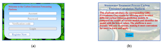 The wastewater treatment process carbon emission accounting platform does not require installation or downloading. The detailed code can be found in the Supplementary Materials. Simply copy and paste the following link into a browser: http://81.69.38.227:2022/userLogin (accessed on 20 October 2022), register, log in, and click to operate. In Figure 2, (a) displays the registration and login interface of the wastewater treatment process carbon emission calculation platform, (b) shows the system introduction interface of the wastewater treatment process carbon emission calculation platform, (c) presents the process selection interface of the wastewater treatment process carbon emission calculation platform, and (d) illustrates the on-site display interface required for the total carbon emission calculation data.