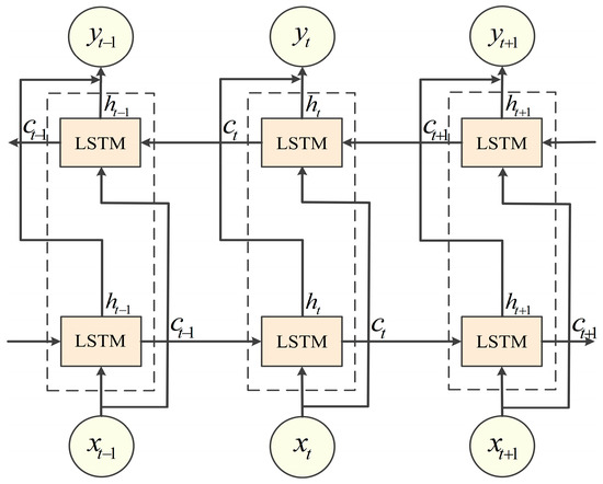 In order to alleviate the long-term dependency problem of traditional recurrent neural networks, Sepp Hochreiter and Jürgen Schmidhuber [22] proposed LSTM in 1997. LSTM realizes the effective processing of sequence data through cell states and three types of gate structures. Building on this, BiLSTM was subsequently proposed, consisting of two LSTM layers running in parallel with opposite directions of information transfer. This allows BiLSTM to process data in both directions simultaneously, thereby enhancing its ability to understand and interpret sequences. The structure of BiLSTM is shown in Figure 1. Siami-Namini et al. [23] conducted a comparison across multiple datasets and found that the prediction accuracy of BiLSTM was improved. It was enhanced by an average of 37.78% compared to LSTM. Given the advantages of BiLSTM in handling sequential data, we employ this technique in our study to obtain better prediction performance. For example, we utilize BiLSTM’s bidirectional information flow to jointly model the historical time-series characteristics of multiple variables (e.g., temperature, humidity, and wind speed) and their inter-temporal dependencies, thereby accurately capturing the dynamic interaction patterns among the variables. In terms of stock price prediction, we analyze the influence of historical data on current prices using BiLSTM’s forward layer and reveal the market sentiment implied by current price fluctuations with the reverse layer, thereby gaining a more comprehensive understanding of the long-range dependencies within the price series.